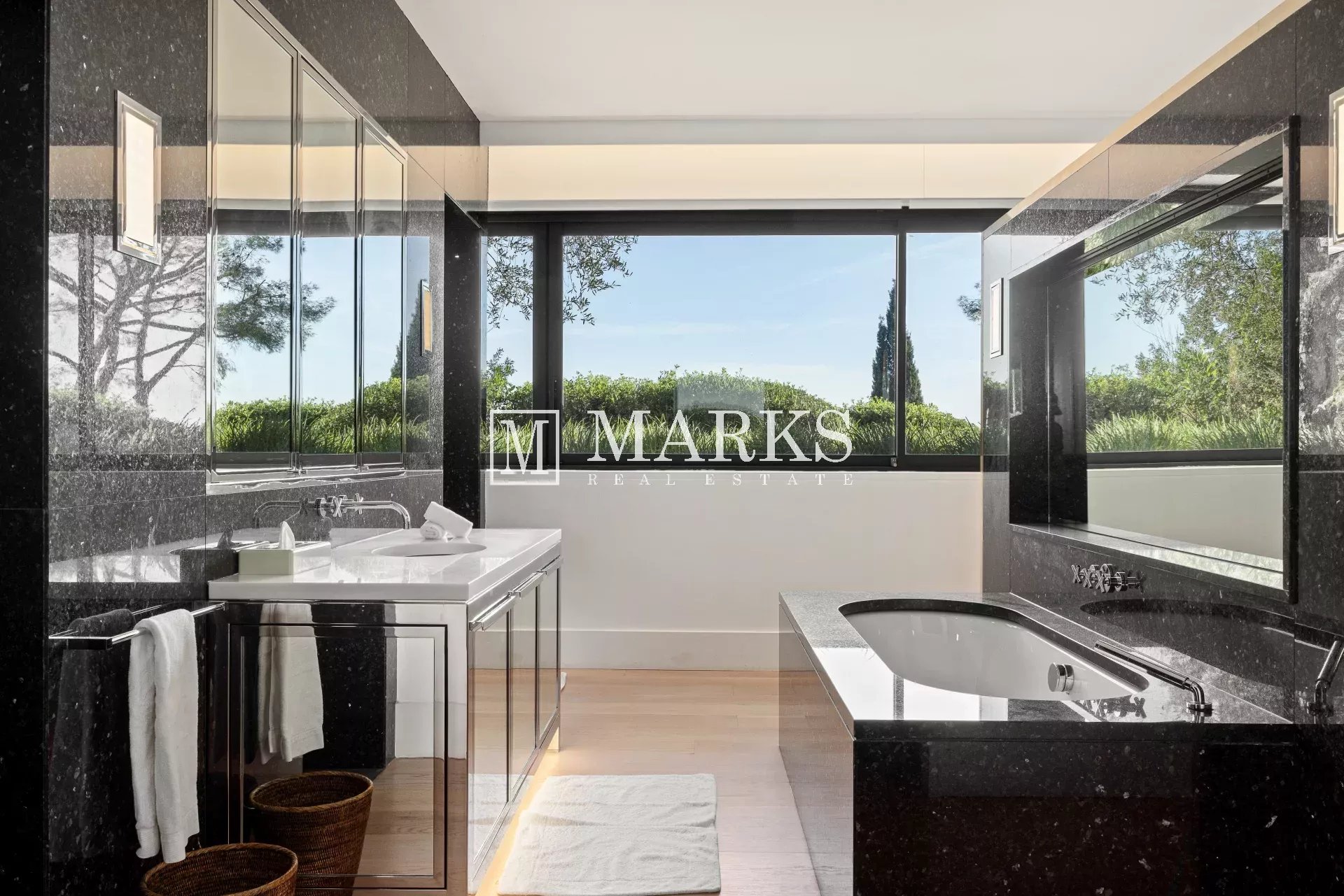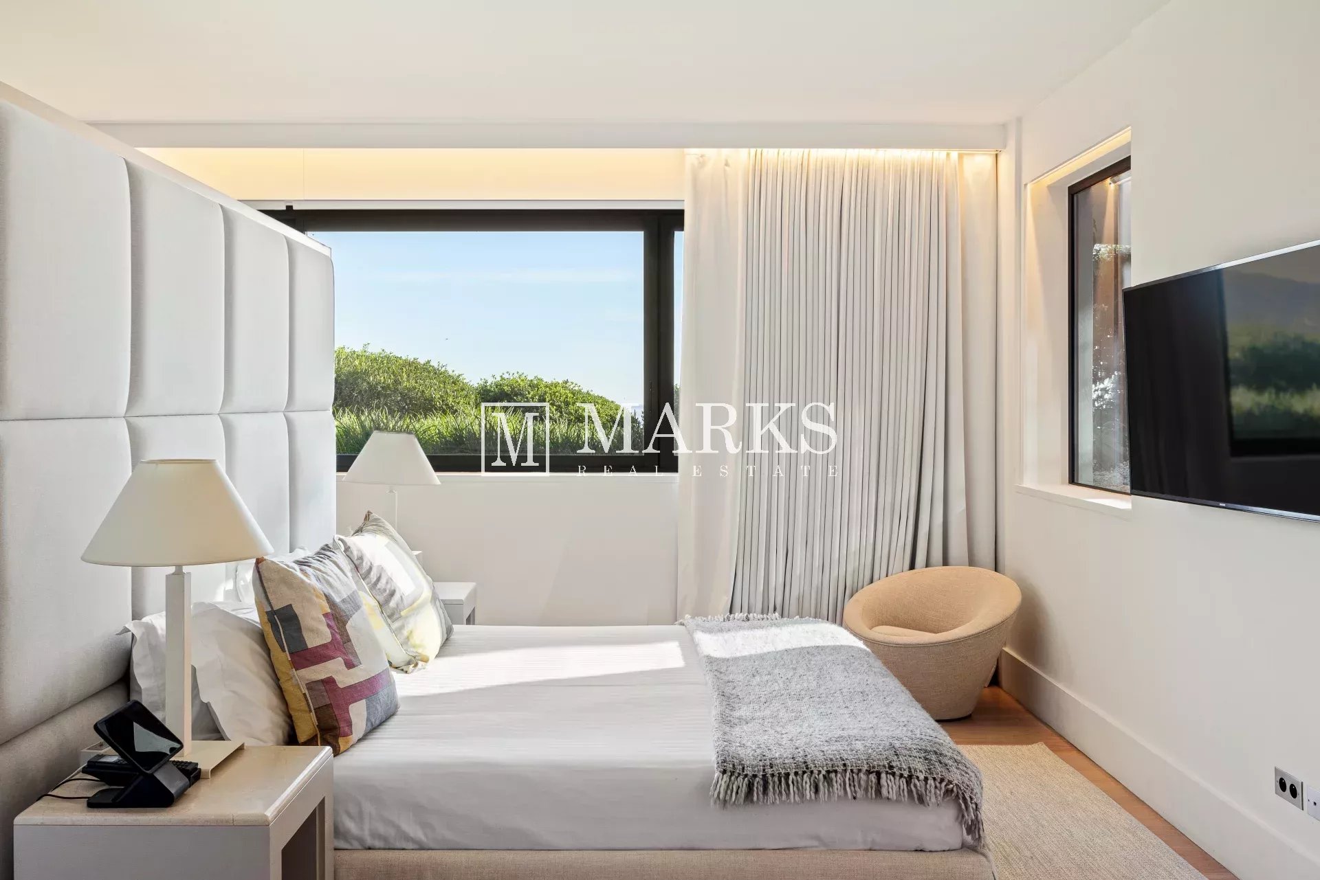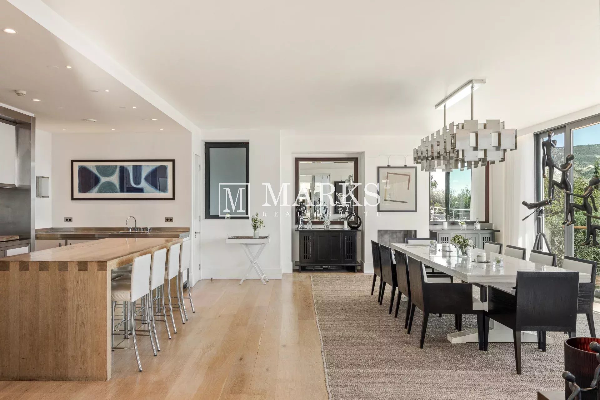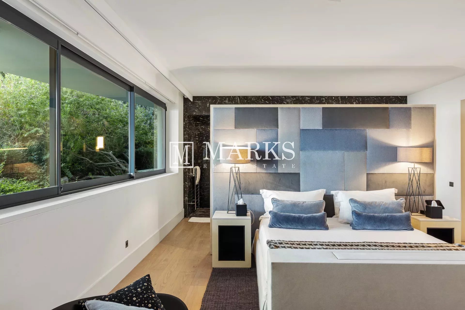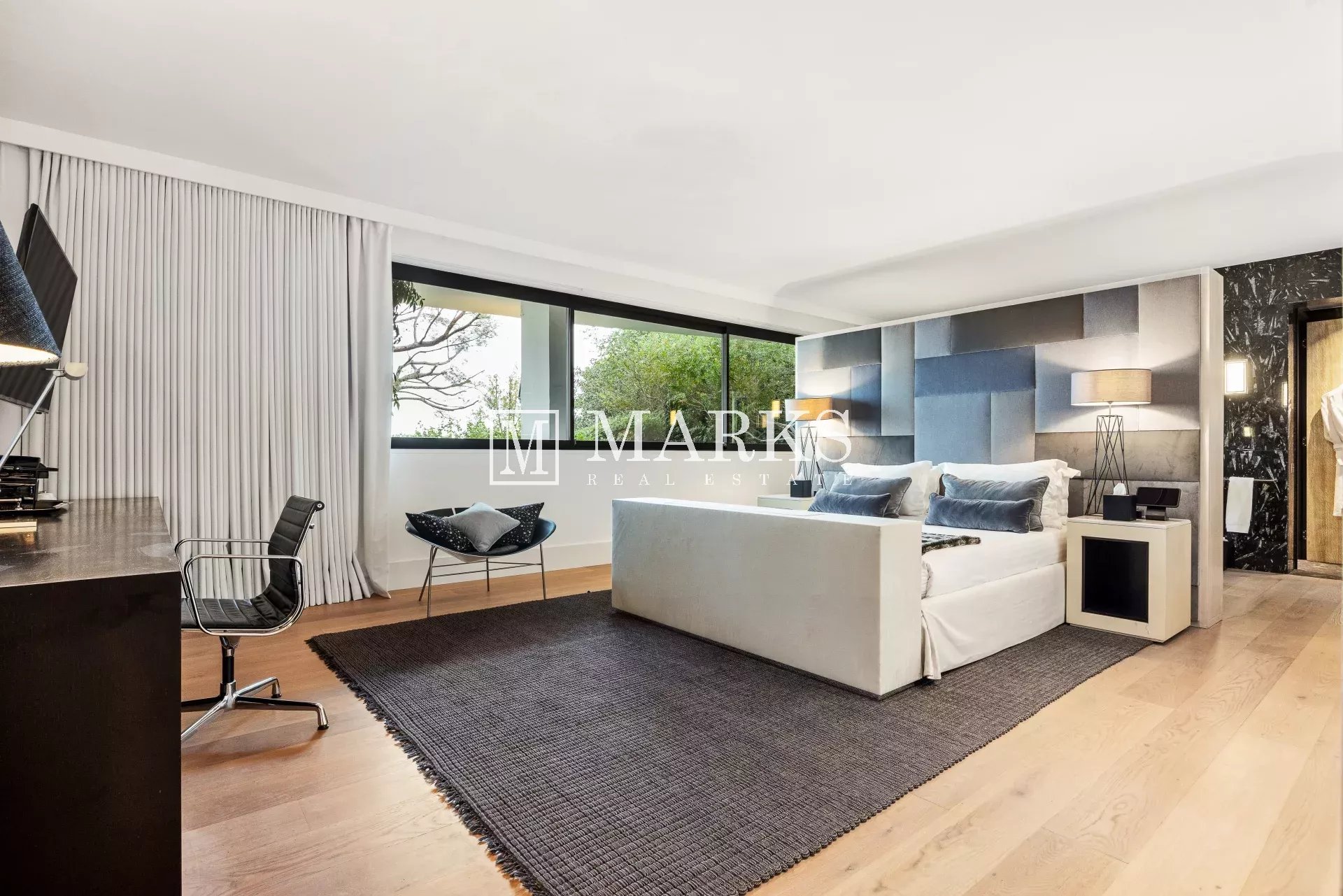 Récemment rénové, l’intérieur présente un design contemporain impeccable. Le salon à double hauteur, la cuisine ouverte et la salle à manger spacieuse sont d’une qualité exceptionnelle, avec un mobilier épuré et discret qui permet au paysage de rester le point de mire. Une salle de cinéma luxueuse, dotée d’une technologie de pointe, permet de se divertir en soirée.