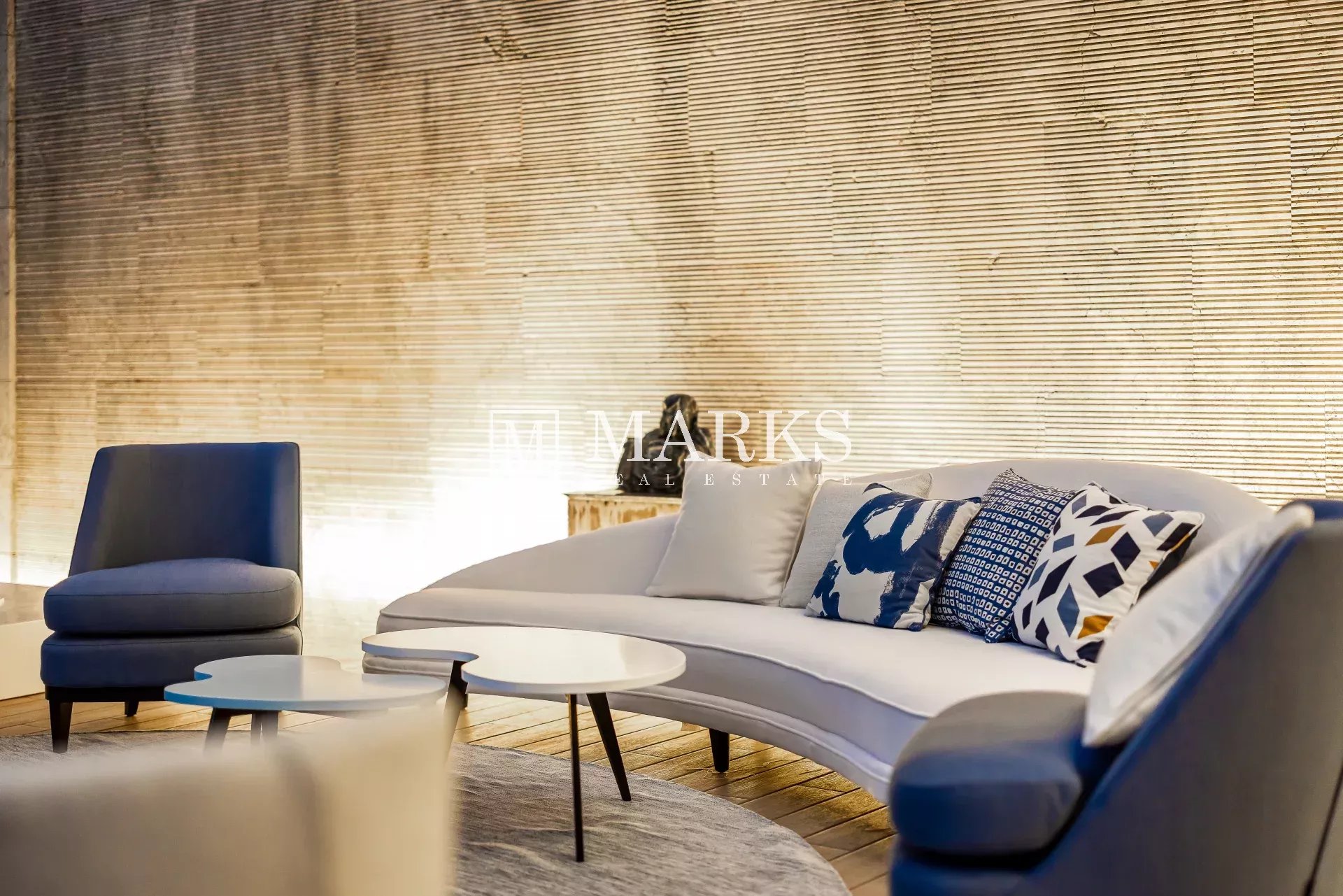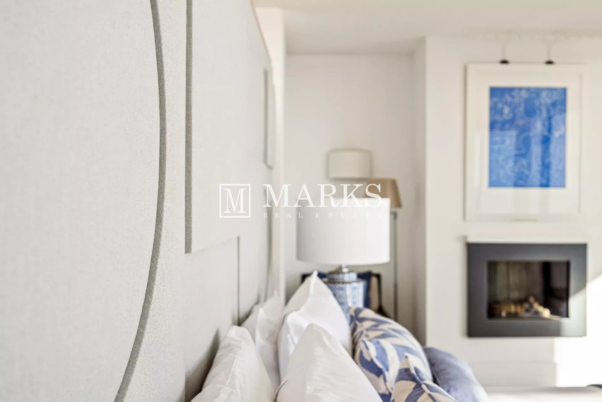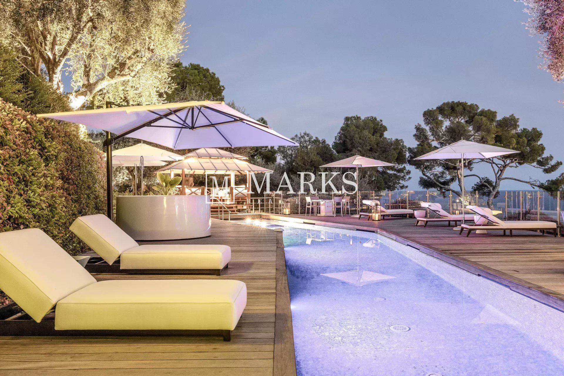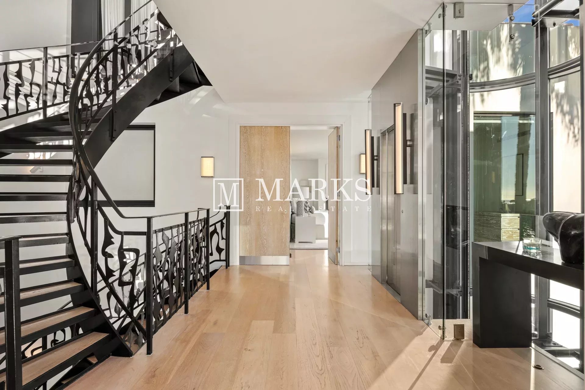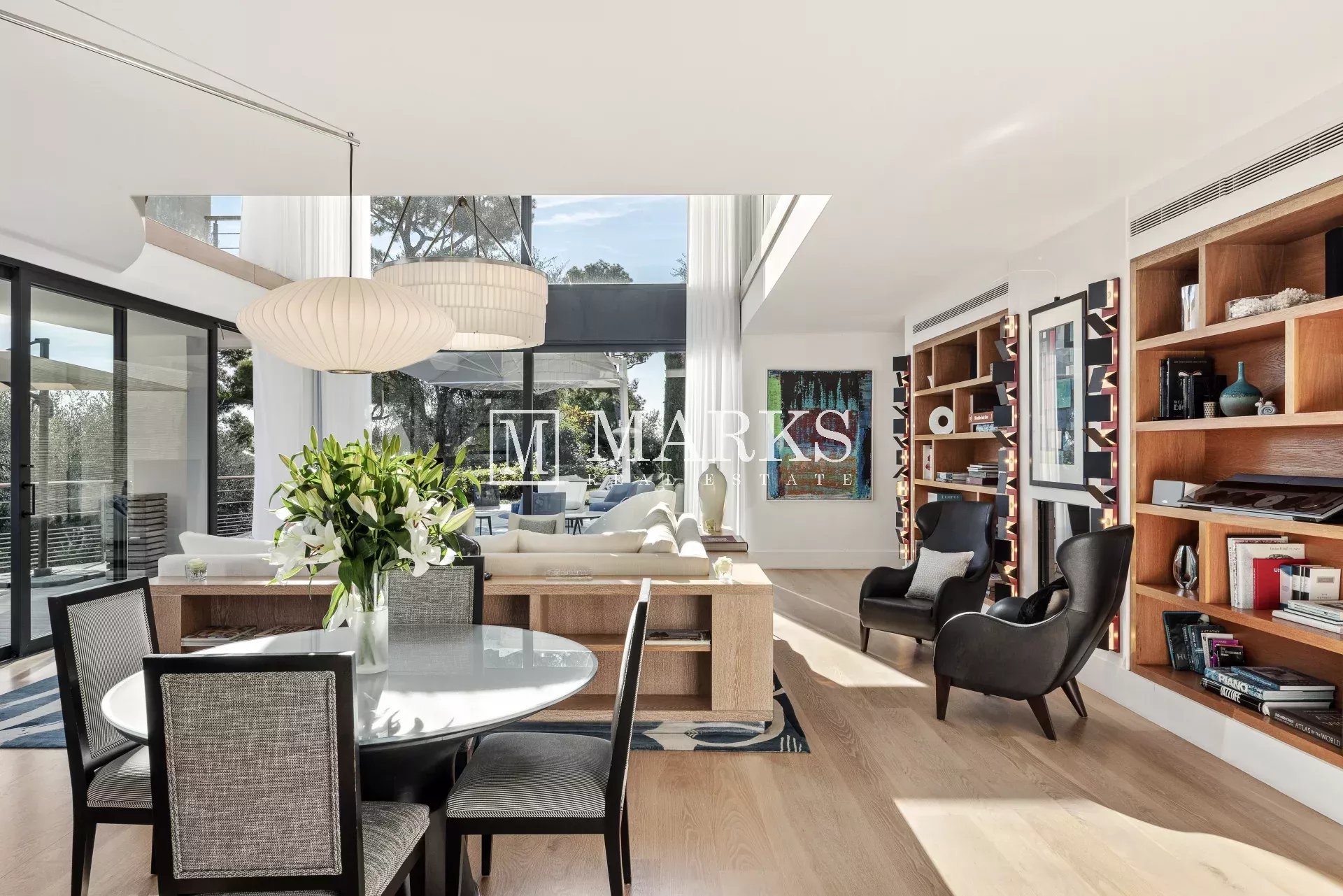 Récemment rénové, l’intérieur présente un design contemporain impeccable. Le salon à double hauteur, la cuisine ouverte et la salle à manger spacieuse sont d’une qualité exceptionnelle, avec un mobilier épuré et discret qui permet au paysage de rester le point de mire. Une salle de cinéma luxueuse, dotée d’une technologie de pointe, permet de se divertir en soirée.