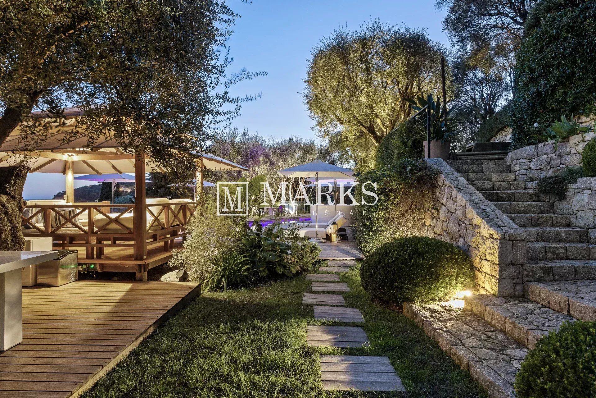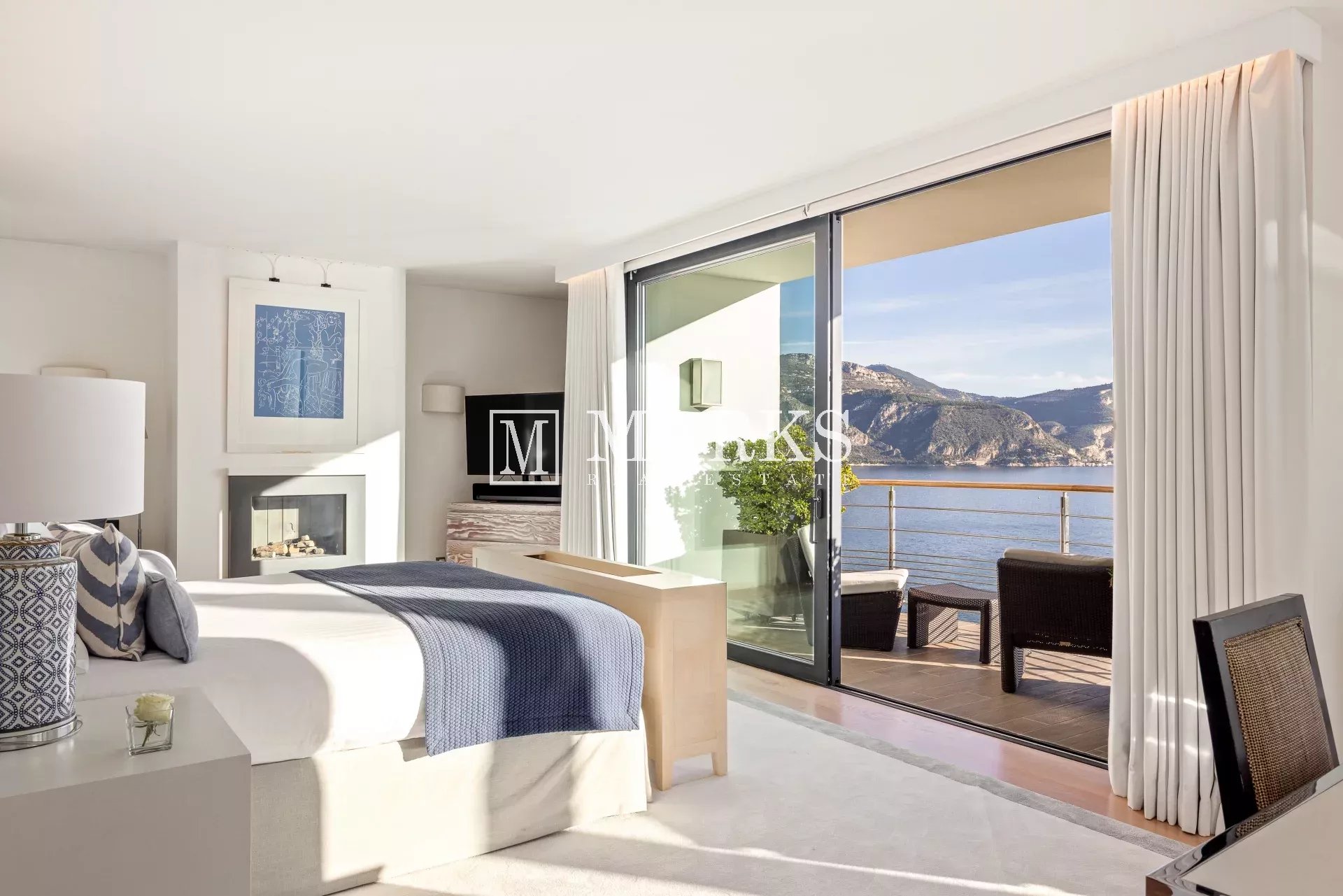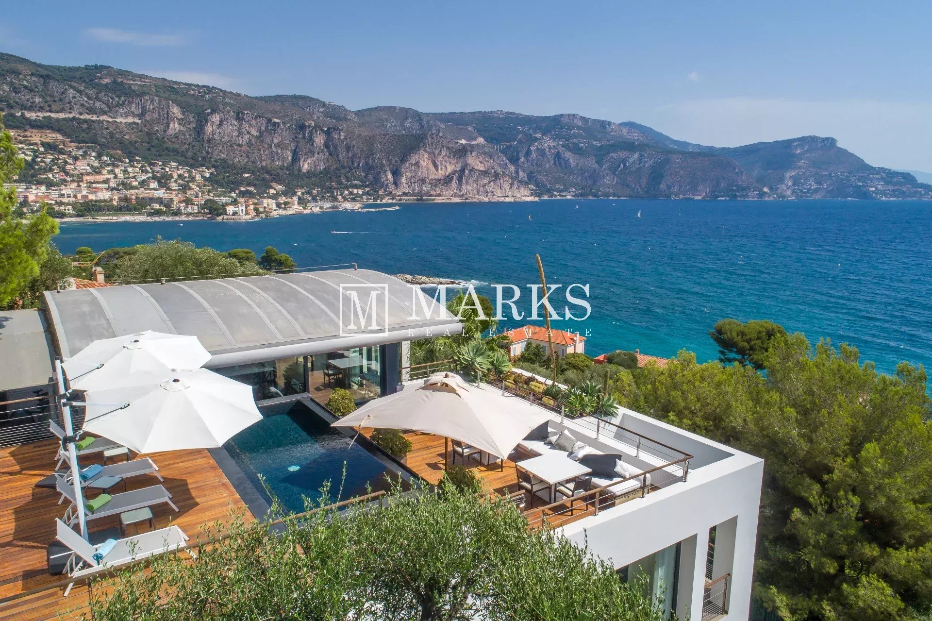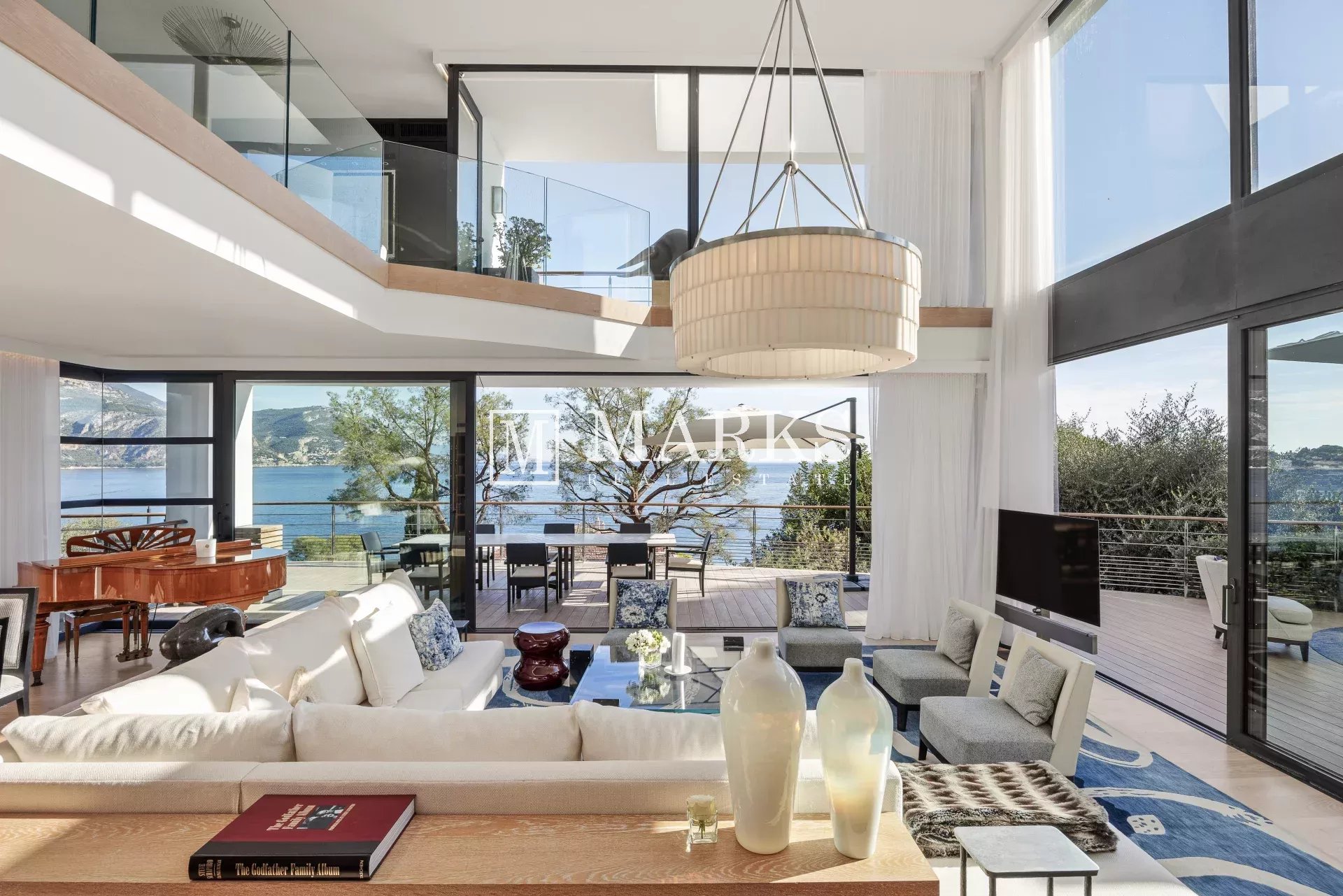 Perchée sur la colline de Saint-Jean-Cap-Ferrat, cette villa contemporaine jouit d’une vue exceptionnelle sur la Méditerranée et le port du Cap-Ferrat. Son architecture saisissante tire le meilleur parti du cadre, avec des fenêtres allant du sol au plafond qui attirent la lumière naturelle et offrent des vues sur la mer depuis presque toutes les pièces. Un ascenseur en verre relie les cinq niveaux, menant à une superbe terrasse sur le toit avec un bain à remous. Des allées descendent à travers le jardin paysager jusqu’à une grande piscine située au bord de la propriété, surplombant la mer en contrebas.
