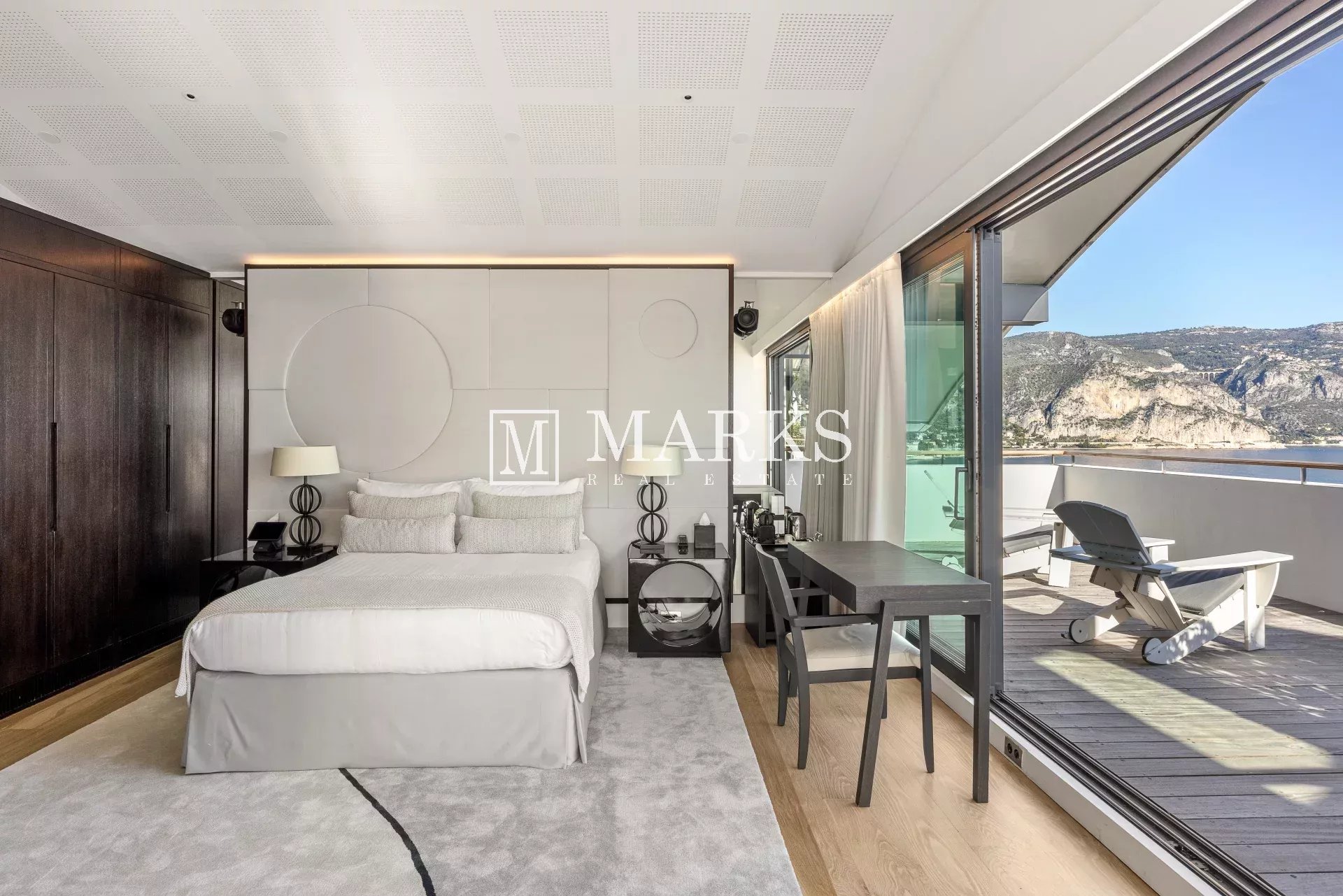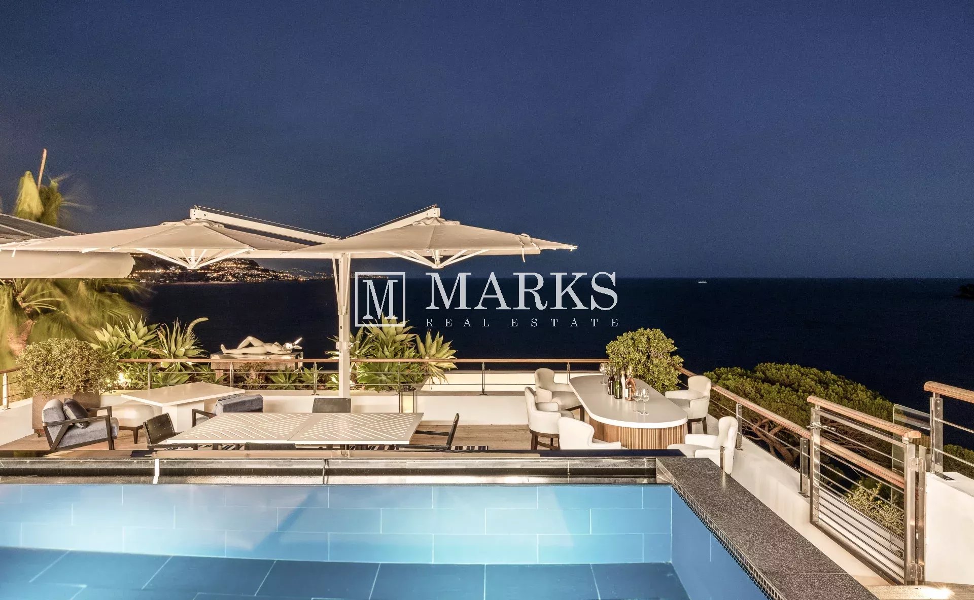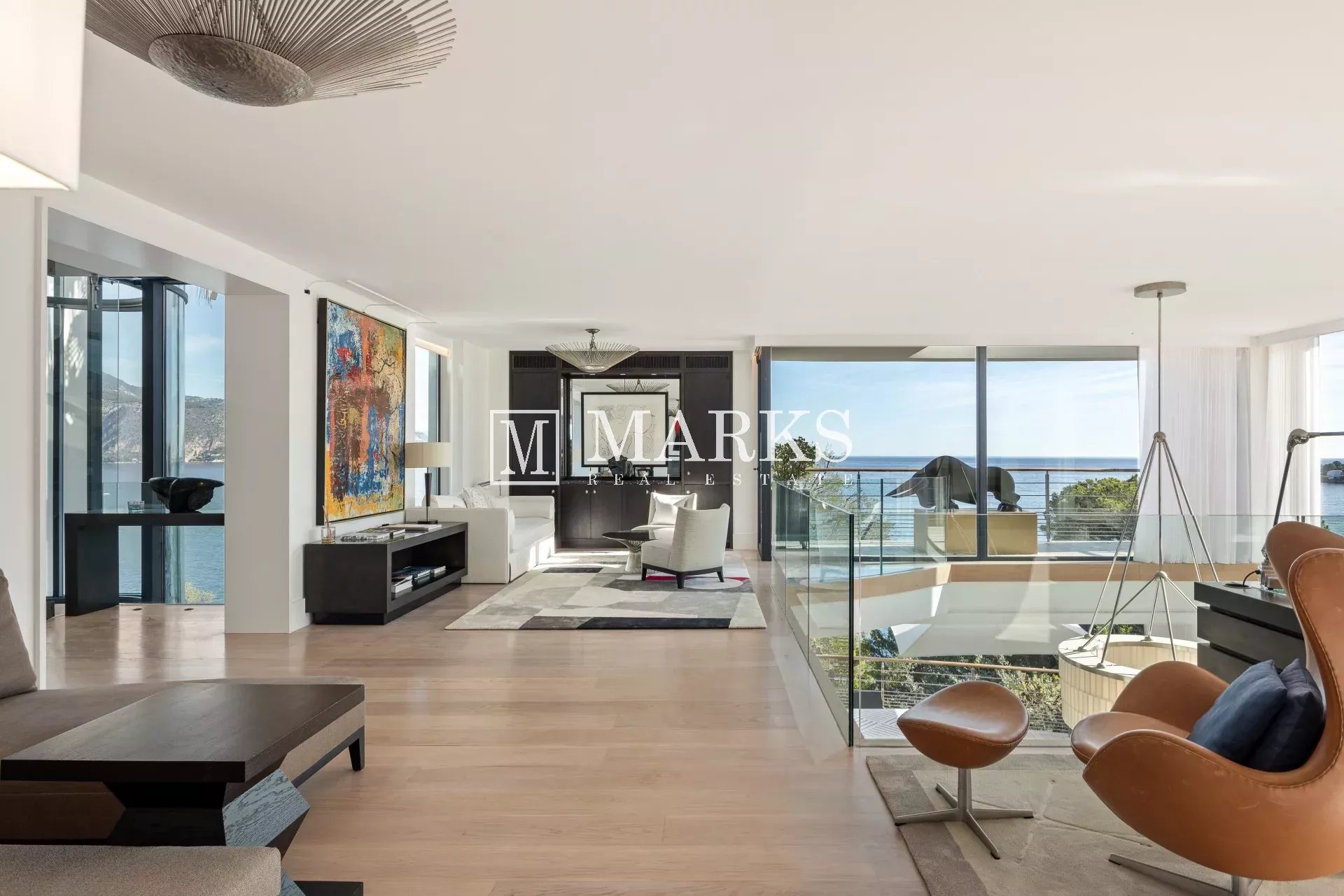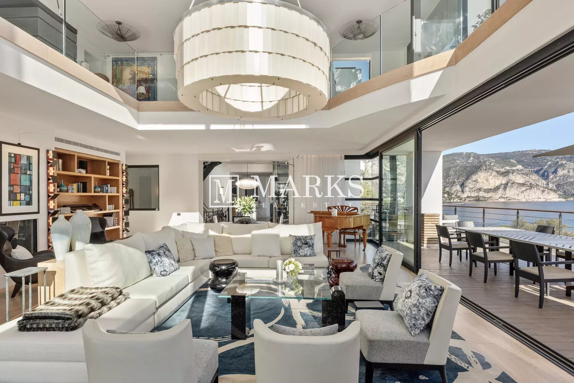 Perchée sur la colline de Saint-Jean-Cap-Ferrat, cette villa contemporaine jouit d’une vue exceptionnelle sur la Méditerranée et le port du Cap-Ferrat. Son architecture saisissante tire le meilleur parti du cadre, avec des fenêtres allant du sol au plafond qui attirent la lumière naturelle et offrent des vues sur la mer depuis presque toutes les pièces. Un ascenseur en verre relie les cinq niveaux, menant à une superbe terrasse sur le toit avec un bain à remous. Des allées descendent à travers le jardin paysager jusqu’à une grande piscine située au bord de la propriété, surplombant la mer en contrebas.