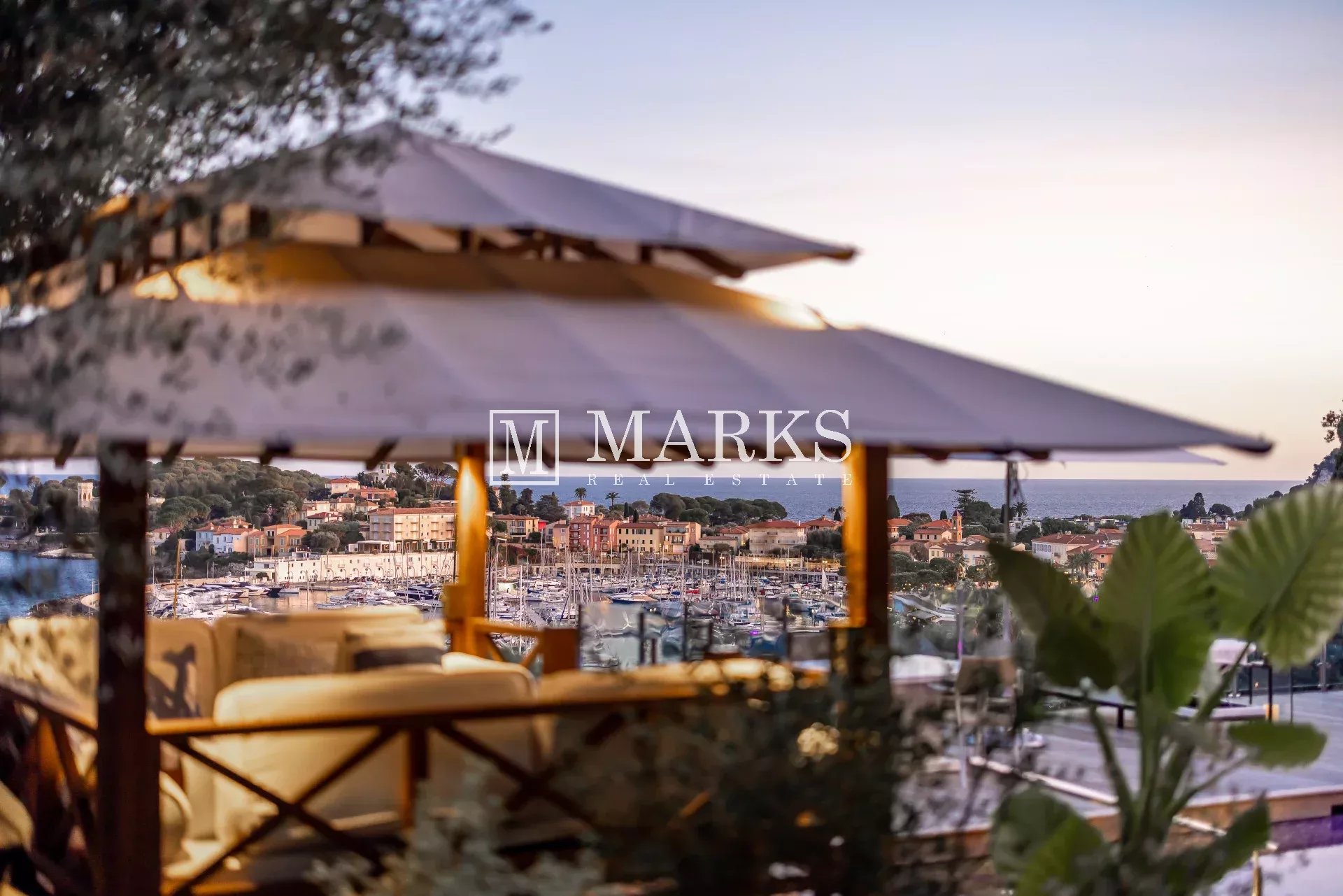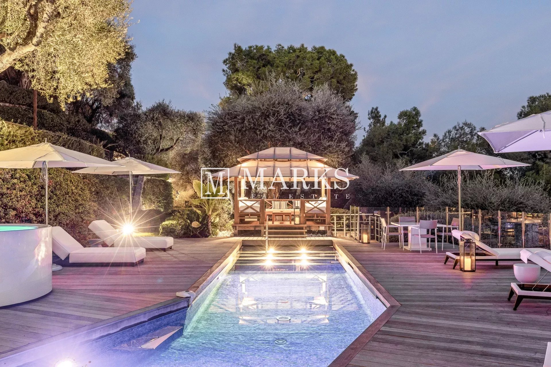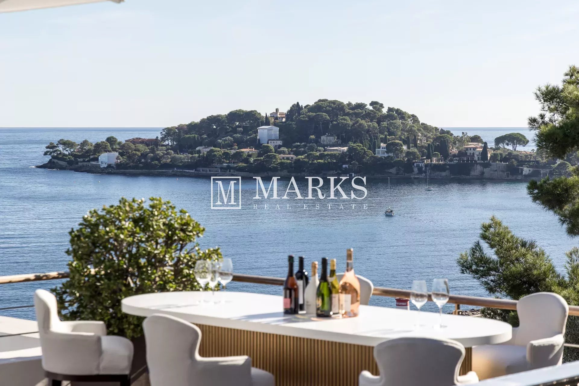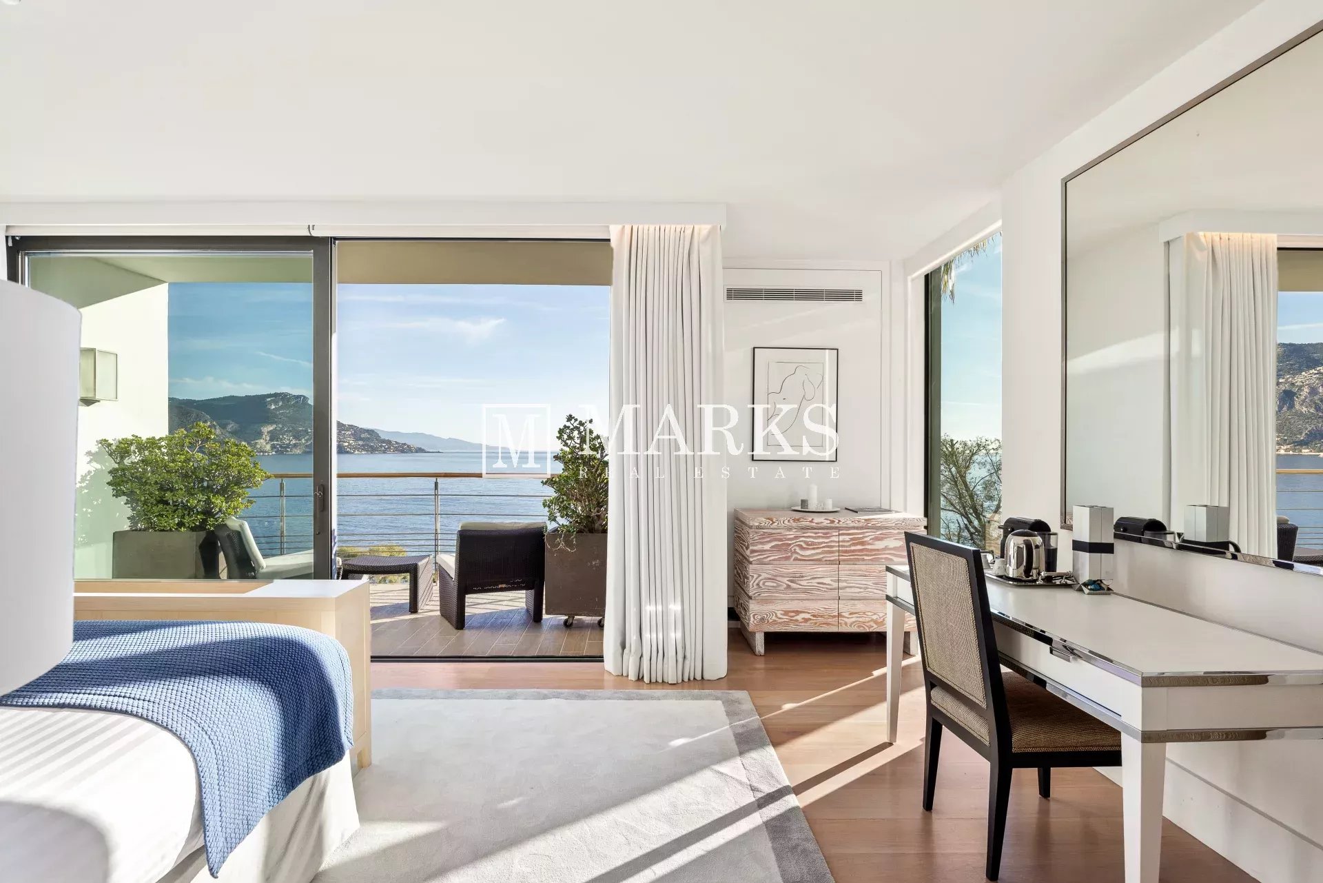 Perchée sur la colline de Saint-Jean-Cap-Ferrat, cette villa contemporaine jouit d’une vue exceptionnelle sur la Méditerranée et le port du Cap-Ferrat. Son architecture saisissante tire le meilleur parti du cadre, avec des fenêtres allant du sol au plafond qui attirent la lumière naturelle et offrent des vues sur la mer depuis presque toutes les pièces. Un ascenseur en verre relie les cinq niveaux, menant à une superbe terrasse sur le toit avec un bain à remous. Des allées descendent à travers le jardin paysager jusqu’à une grande piscine située au bord de la propriété, surplombant la mer en contrebas.