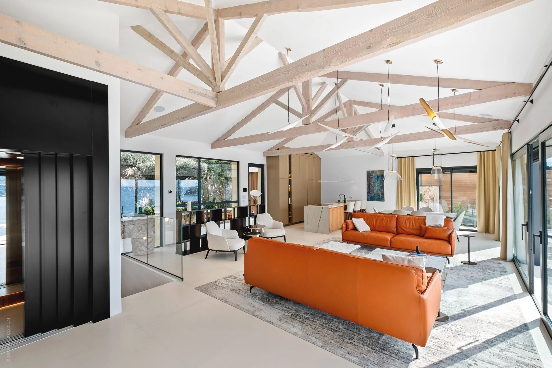 L’entrée s’ouvre sur un vaste espace de vie à la fois élégant et chaleureux. Les hauts plafonds cathédrale et la cheminée à éthanol apportent du caractère à la pièce, qui se prolonge harmonieusement vers la salle à manger, ouverte sur une grande terrasse entourant la villa. La cuisine ouverte, entièrement équipée avec des appareils Miele de haute qualité, offre tout le nécessaire pour un confort culinaire optimal.